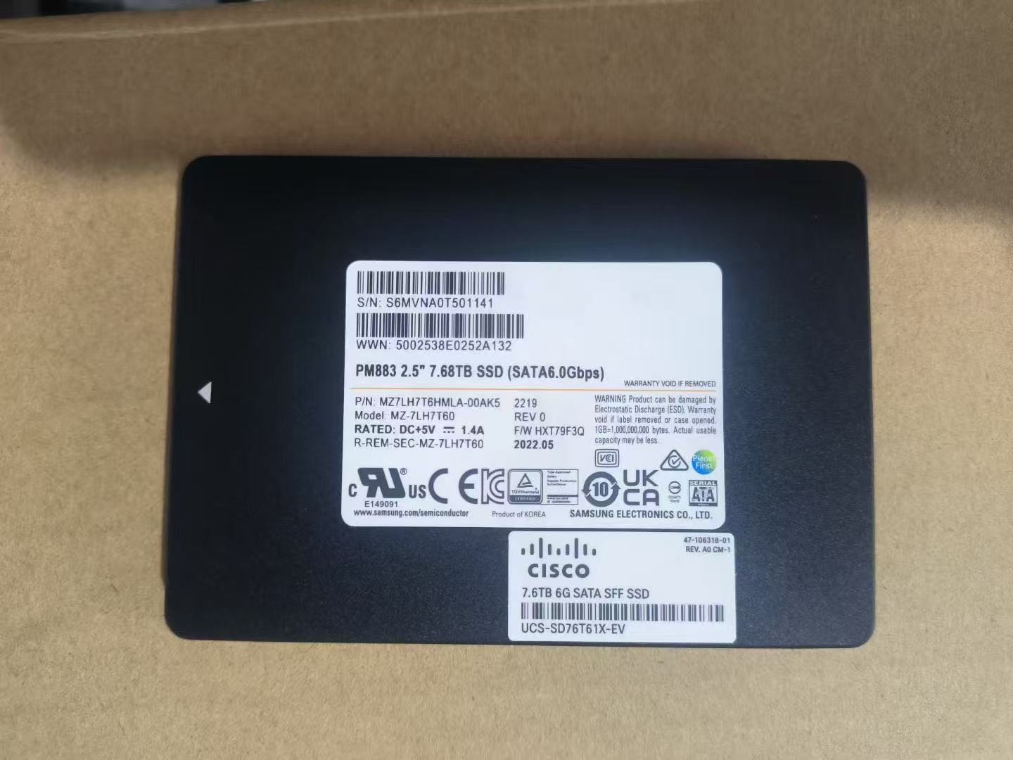 Cisco UCS-SD76T61X-EV 7.68TB 2.5″ SATA 6Gbps SFF SSD (Samsung PM883, Model MZ-7LH7T60, P/N MZ7LH7T6HMLA-00A5, 5V 1.4A, Firmware HXT79F3Q, 2022.05)